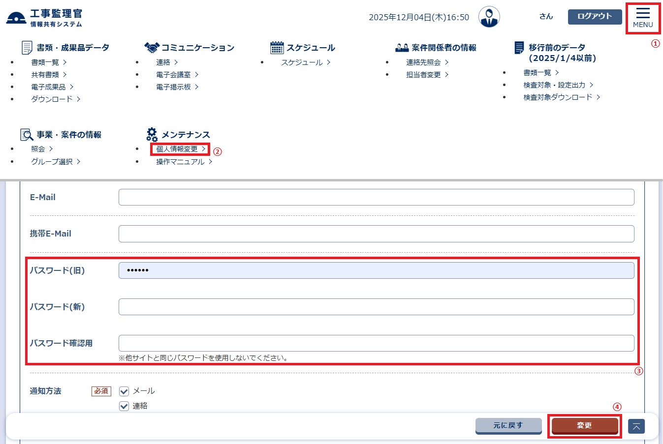 ログイン後、右上メニュー内の【メンテナンス】-【個人情報変更】から変更することが出来ます。