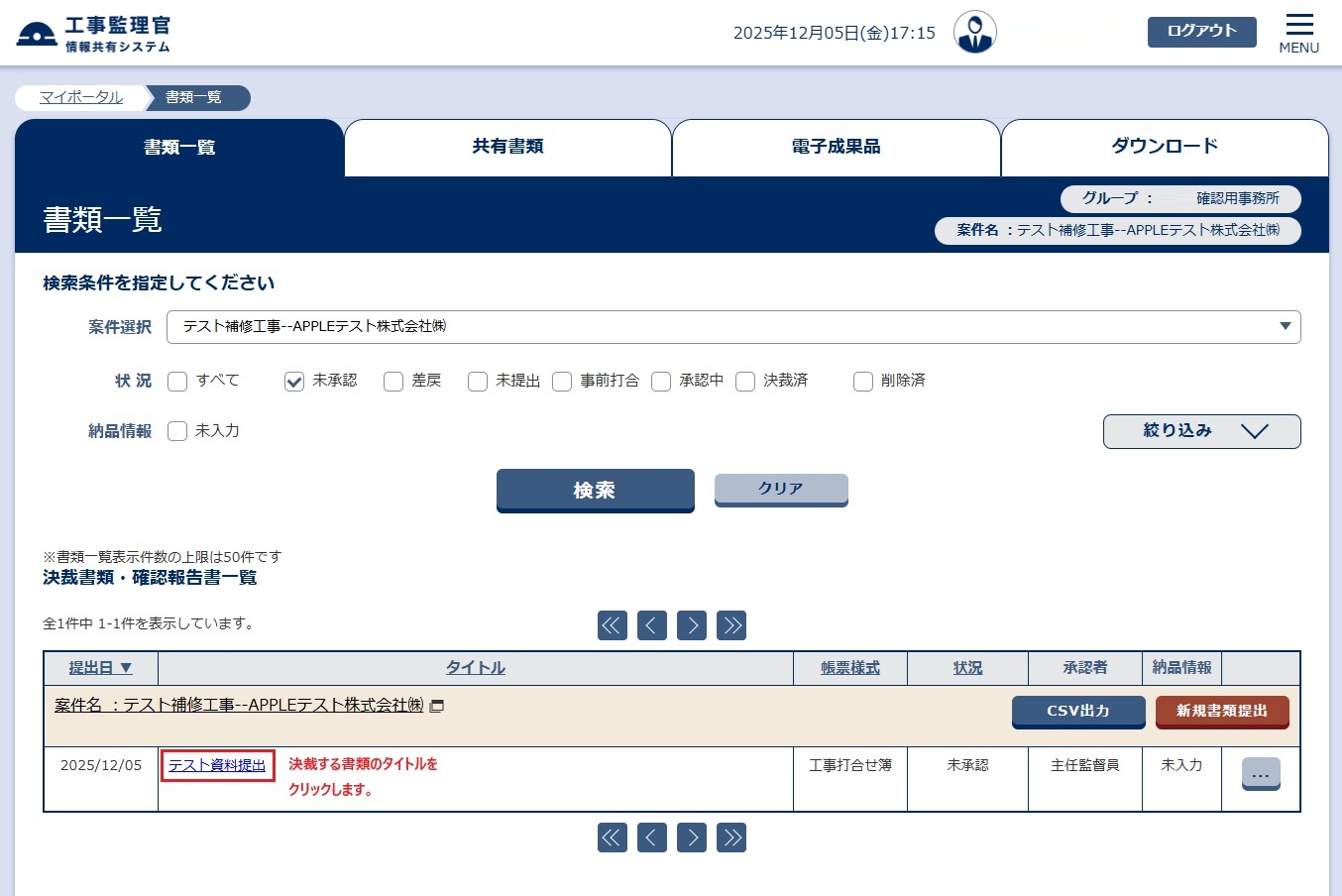 チェックの上【検索】ボタンをクリックすると、該当案件に関わる書類が一覧表示されます。