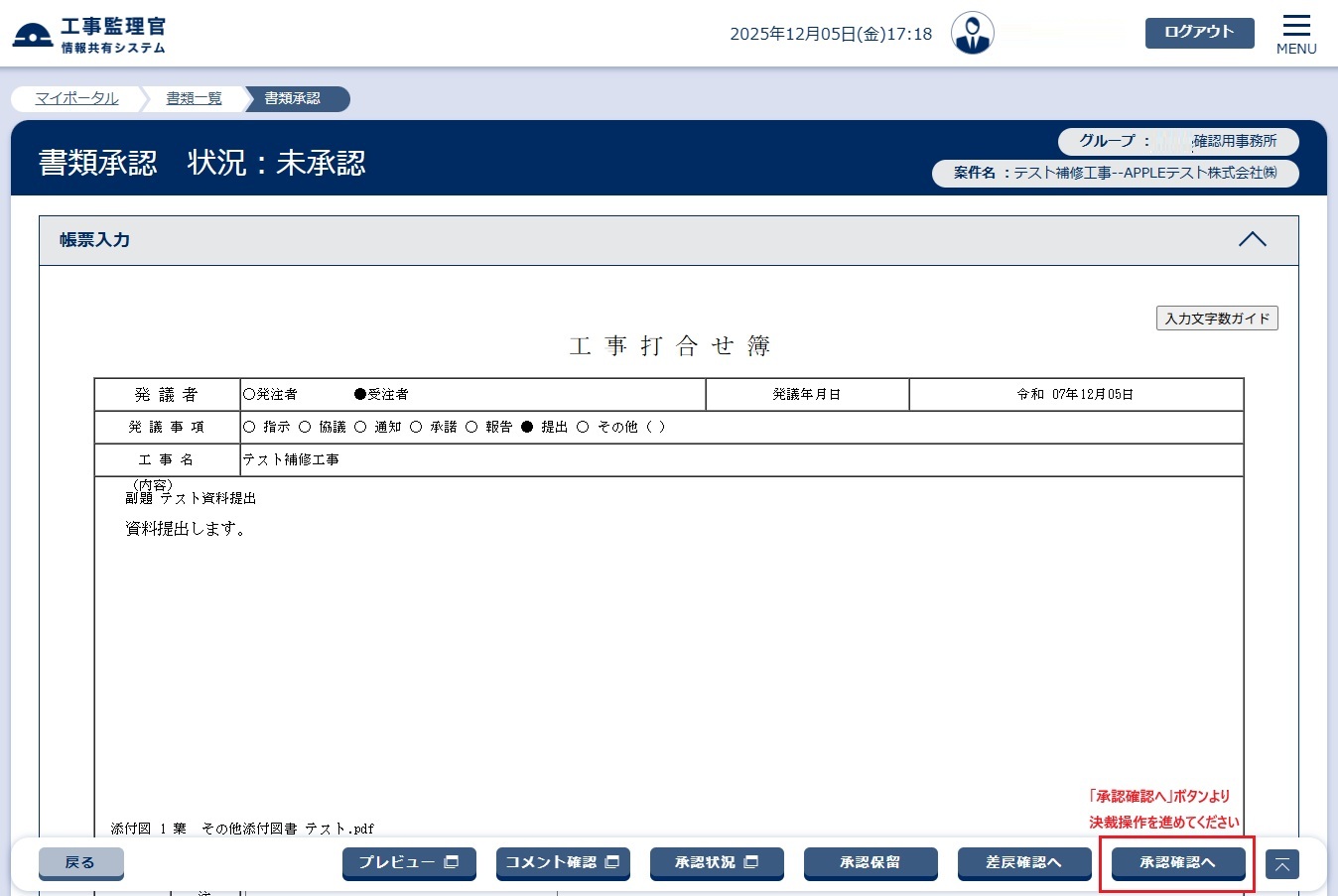 決裁したい書類のタイトルをクリック後、「承認確認へ」ボタンより決裁操作を進めてください。