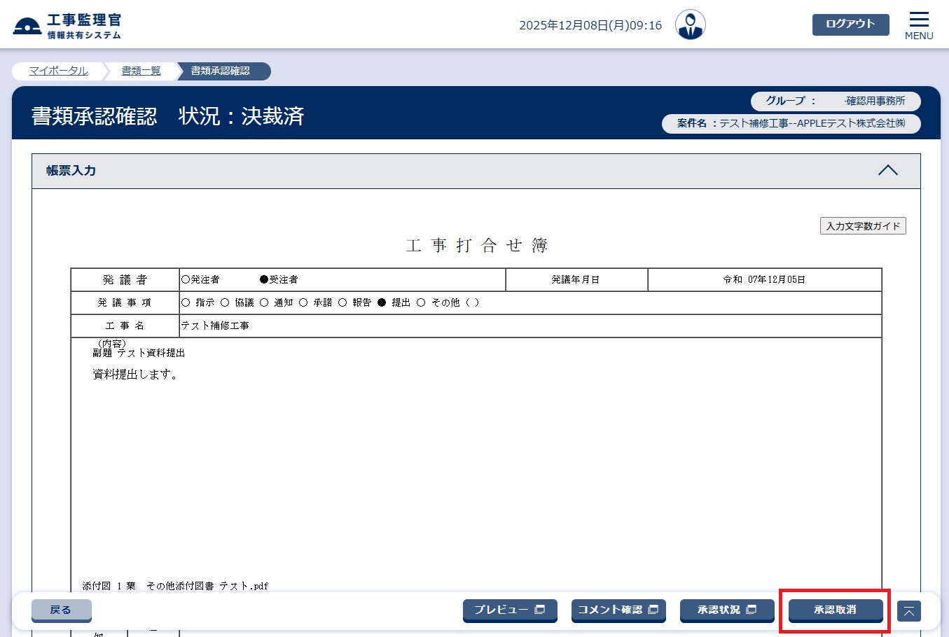 決裁した書類を表示させ、「承認取消」操作を行ってください。その後コメントを入力し