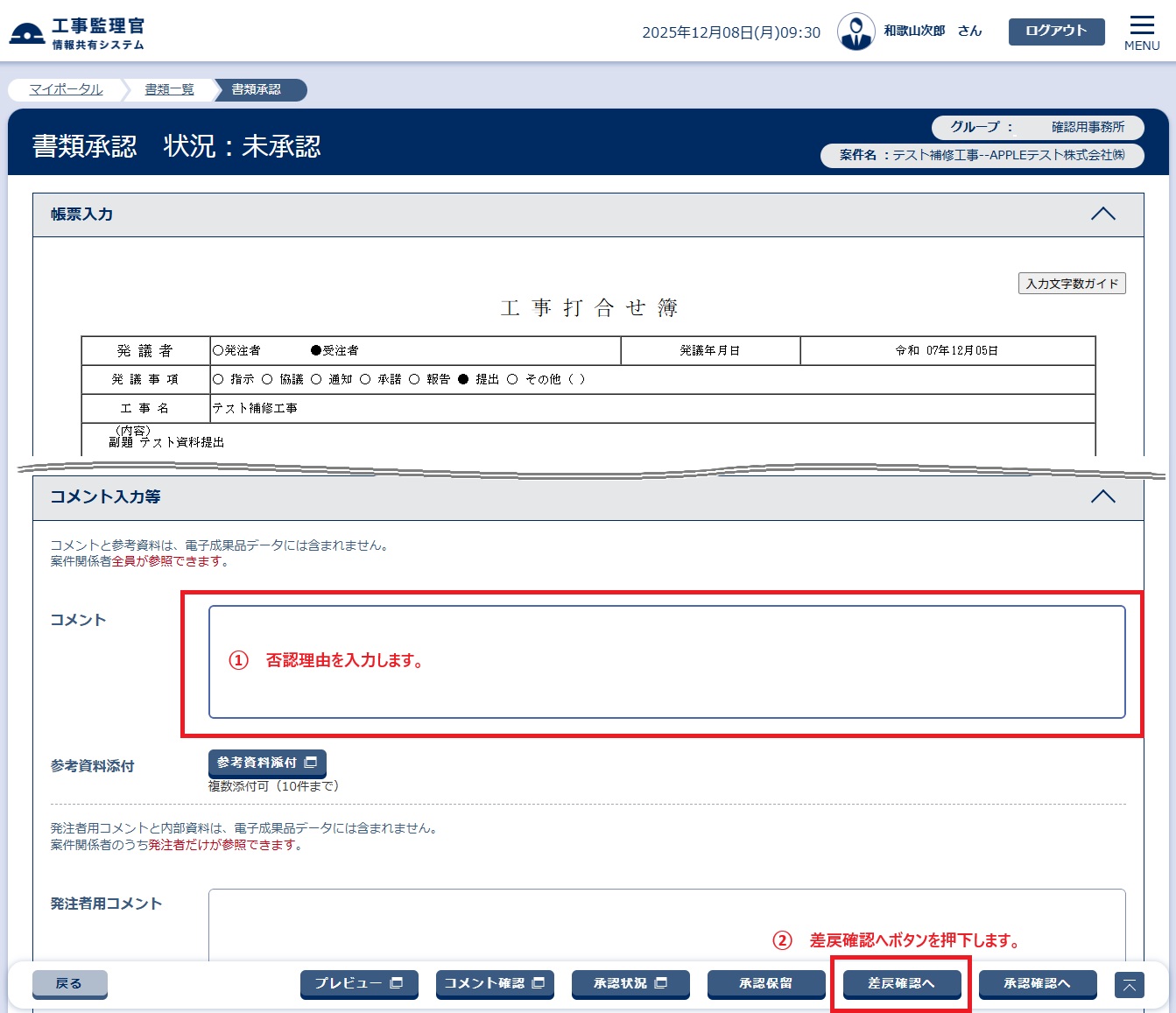 「差戻確認へ」ボタンより差戻処理を行ってください。