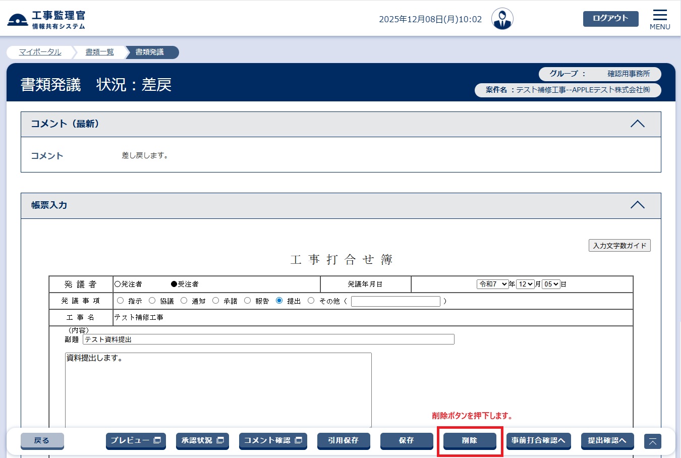 すでに決裁完了している書類に関しては、最終承認者が「承認取消」を行ってから、提出者に否認・差戻しを行い、提出者が「削除」してください。