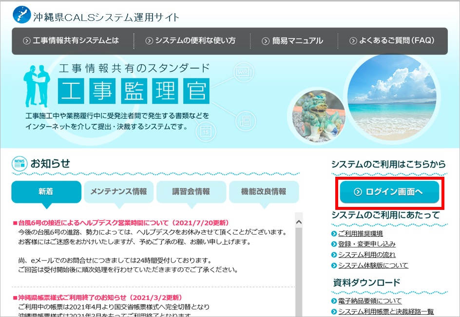 沖縄県CALSシステムのトップページにはお知らせを掲載しており、沖縄県やCALSシステムからの発信情報をご覧頂きたいことから、