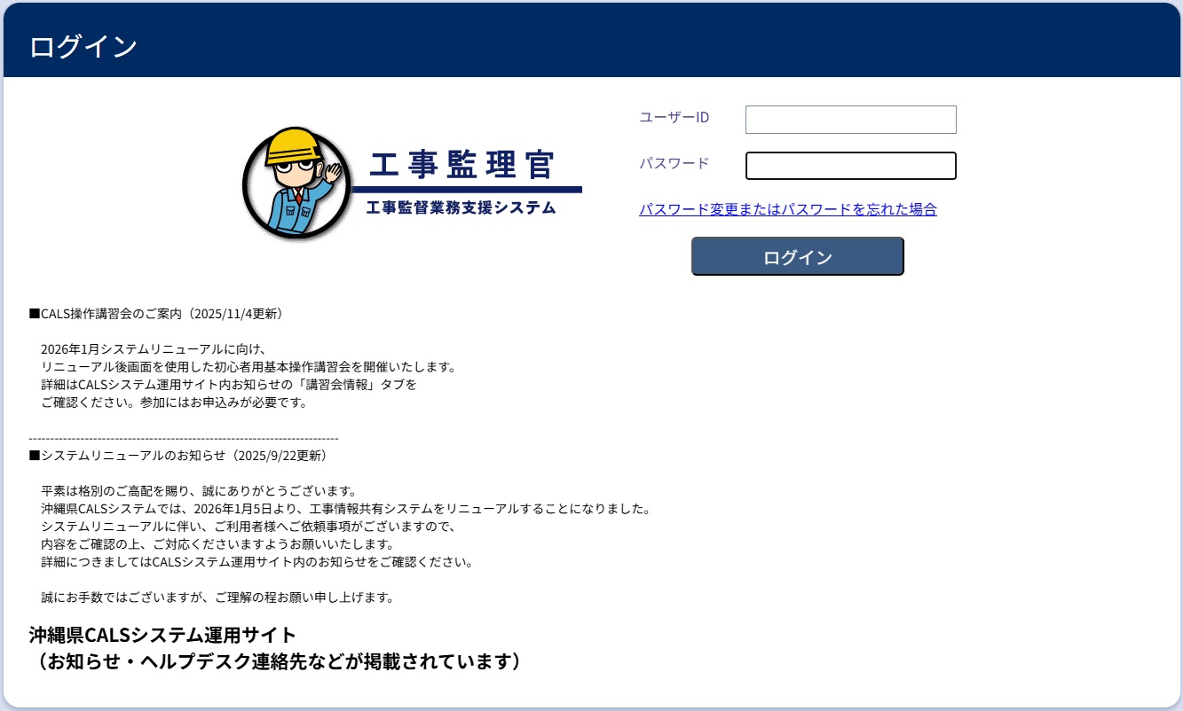 ショートカットやお気に入り登録には、工事監理官のログイン画面でなく、「沖縄県CALSシステムのトップページ画面」のご登録をお勧め致します。